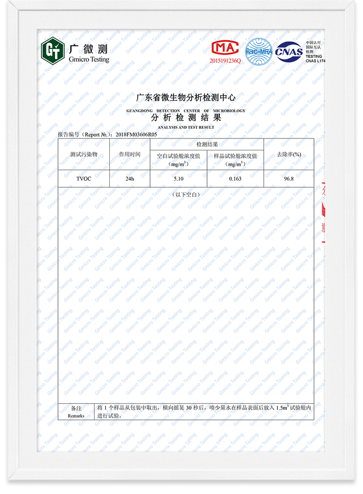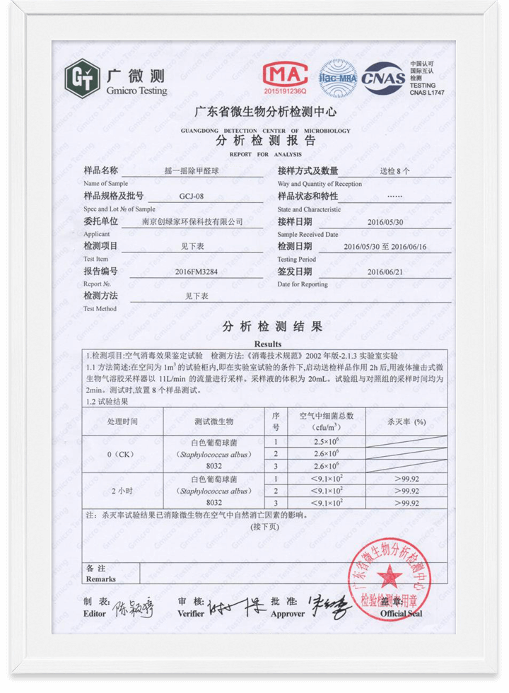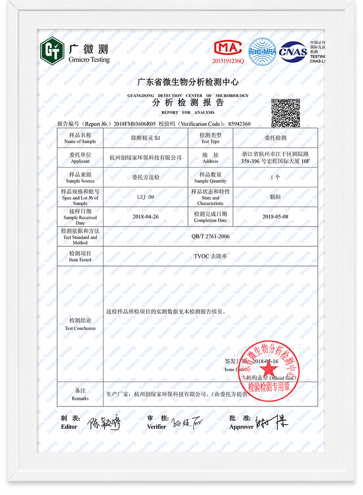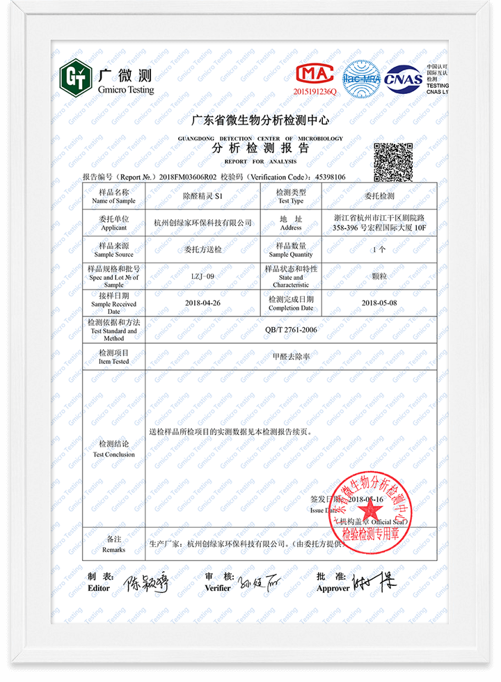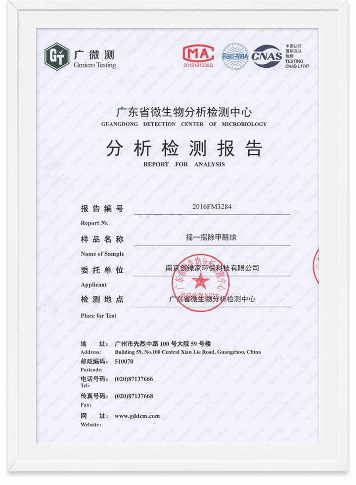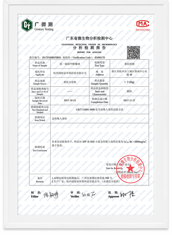 除甲醛魔球無毒檢測報告