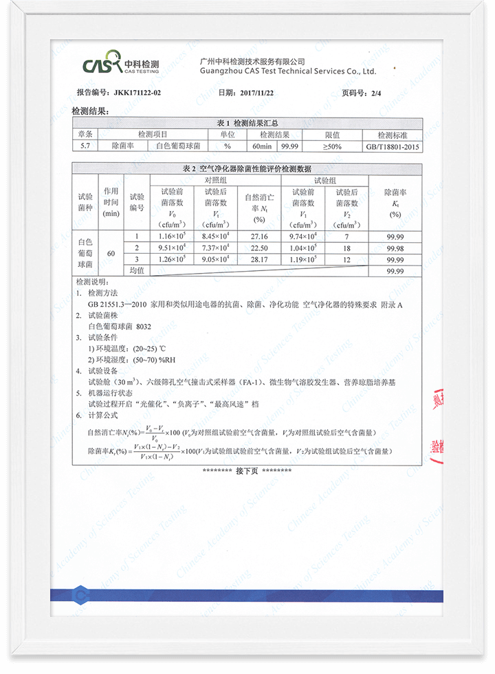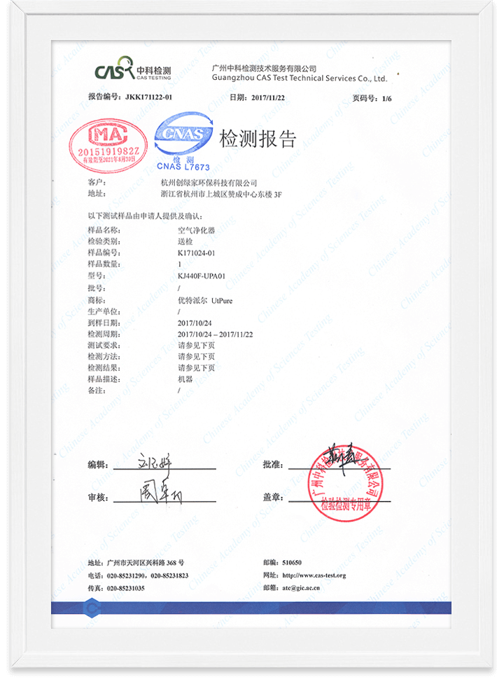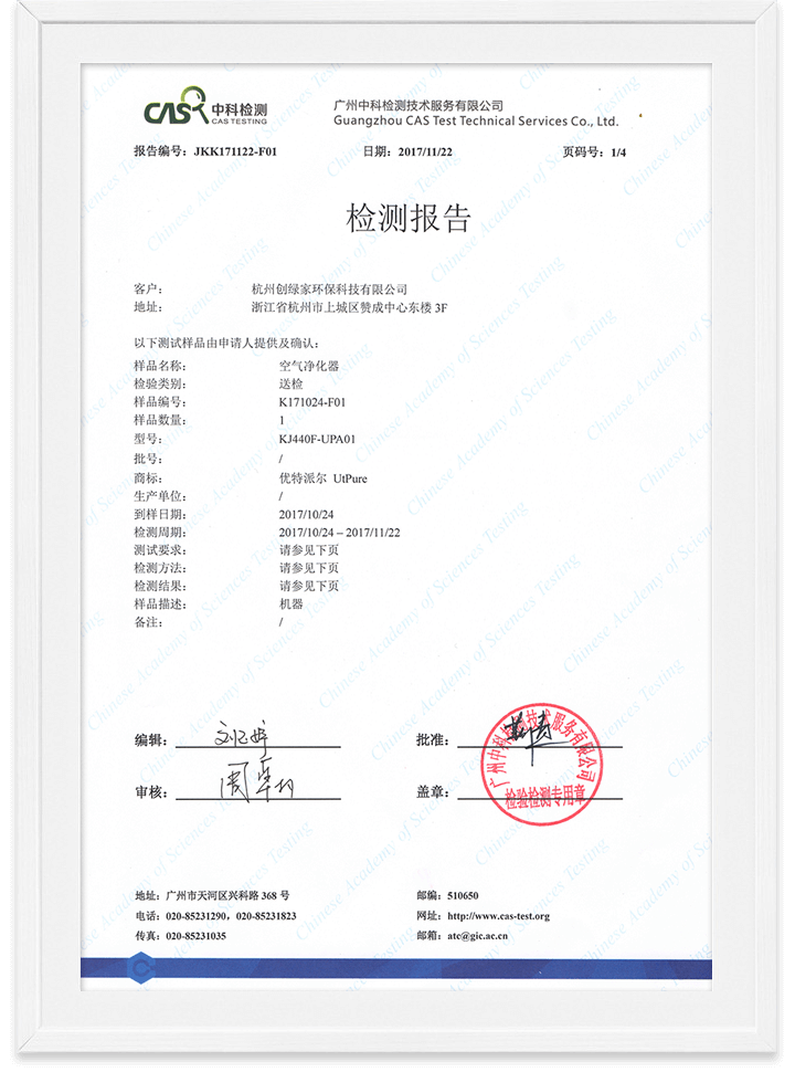 優(yōu)特派爾空氣凈化器甲醛清除率/細菌清除率檢測報告