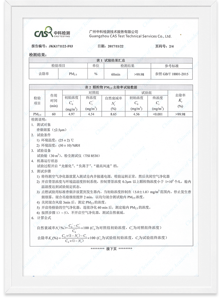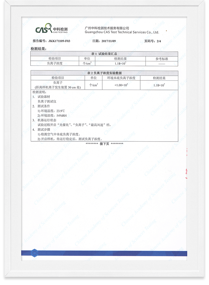 優(yōu)特派爾空氣凈化器PM2.5去除率/負離子濃度檢測報告