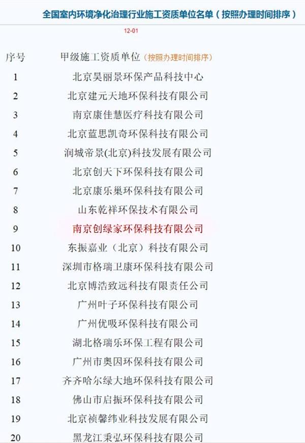 恭喜南京創(chuàng)綠家環(huán)??萍加邢薰精@得全國室內(nèi)環(huán)境凈化治理行業(yè)甲級(jí)施工資質(zhì)證書?。?!目前全國室內(nèi)環(huán)境凈化治理行業(yè)具有甲級(jí)施工資質(zhì)的企業(yè)僅有20家,創(chuàng)綠家是第九位獲得全國甲級(jí)施工資質(zhì)的公司! 此外,創(chuàng)綠家環(huán)??萍加邢薰具€是中國室內(nèi)裝飾協(xié)會(huì)室內(nèi)環(huán)境凈化治理委員會(huì)會(huì)員單位、中國建筑室內(nèi)生態(tài)環(huán)境綜合研究課題承擔(dān)企業(yè)、全國室內(nèi)車內(nèi)環(huán)境凈化治理先進(jìn)單位!