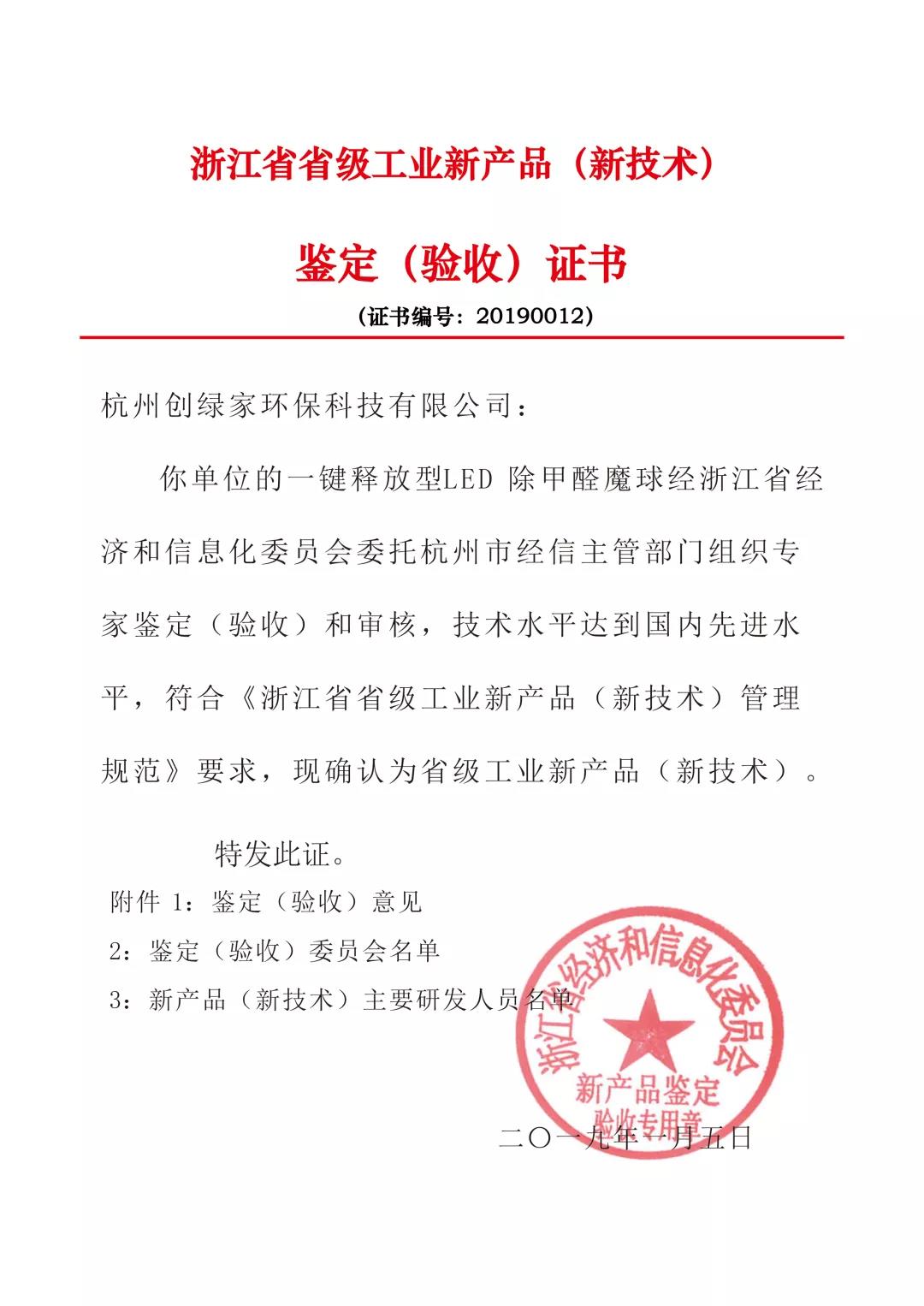 創(chuàng)綠家環(huán)保旗下明星產(chǎn)品搖一搖除甲醛魔球經(jīng)浙江省經(jīng)濟和信息化委員會委托杭州市經(jīng)信主管部門組織專家鑒定(驗收)和審核,技術(shù)水平達到國內(nèi)先進水平,符合《浙江省省級工業(yè)新產(chǎn)品(新技術(shù))管理規(guī)范》要求,現(xiàn)確認為省級工業(yè)新產(chǎn)品(新技術(shù))。