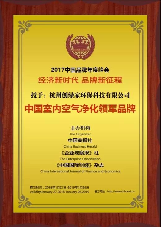 2018年1月26日-28日,由中國商報社、《企業(yè)觀察報》社和《中國國際財經(jīng)》雜志聯(lián)合主辦的“2017中國品牌年度峰會”在京隆重舉行。杭州創(chuàng)綠家環(huán)??萍加邢薰緲s獲“中國室內(nèi)空氣凈化領(lǐng)軍品牌”殊榮。