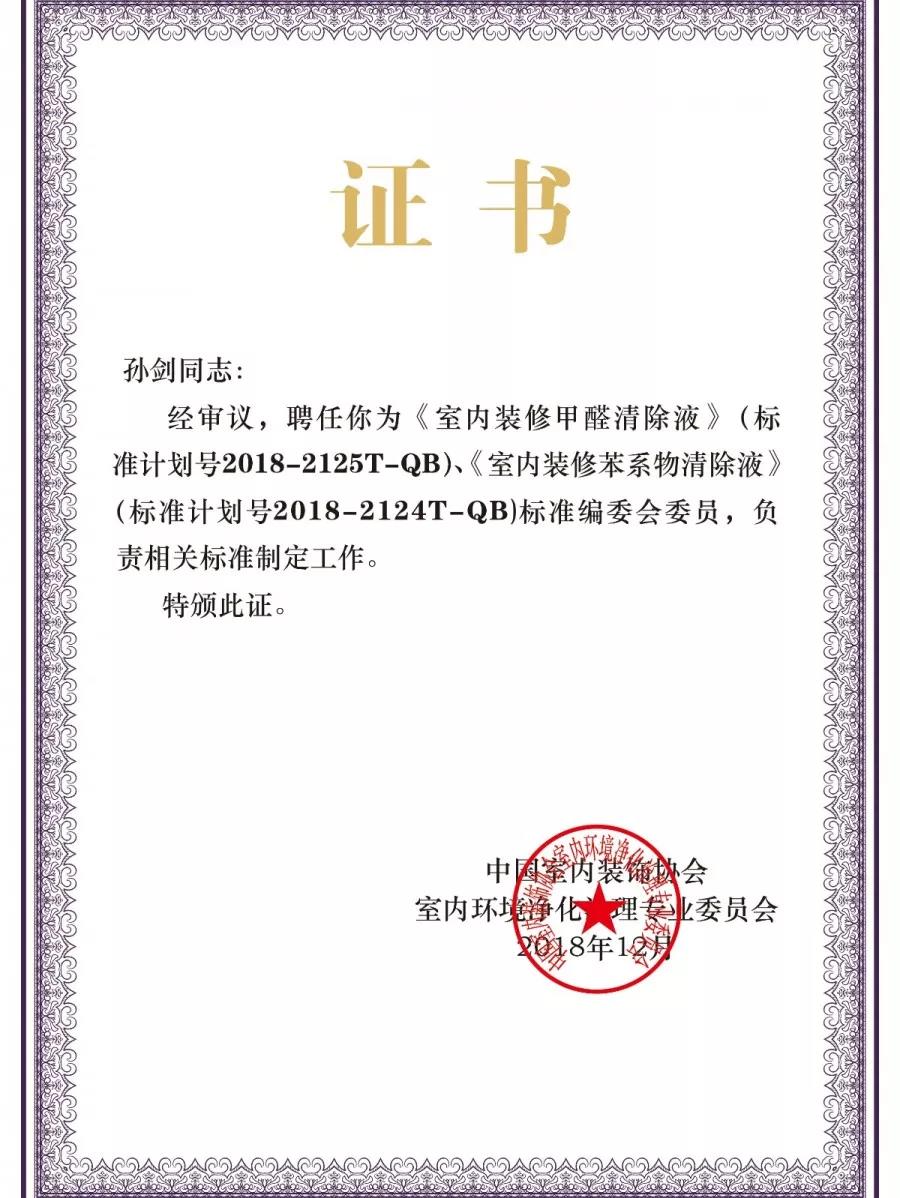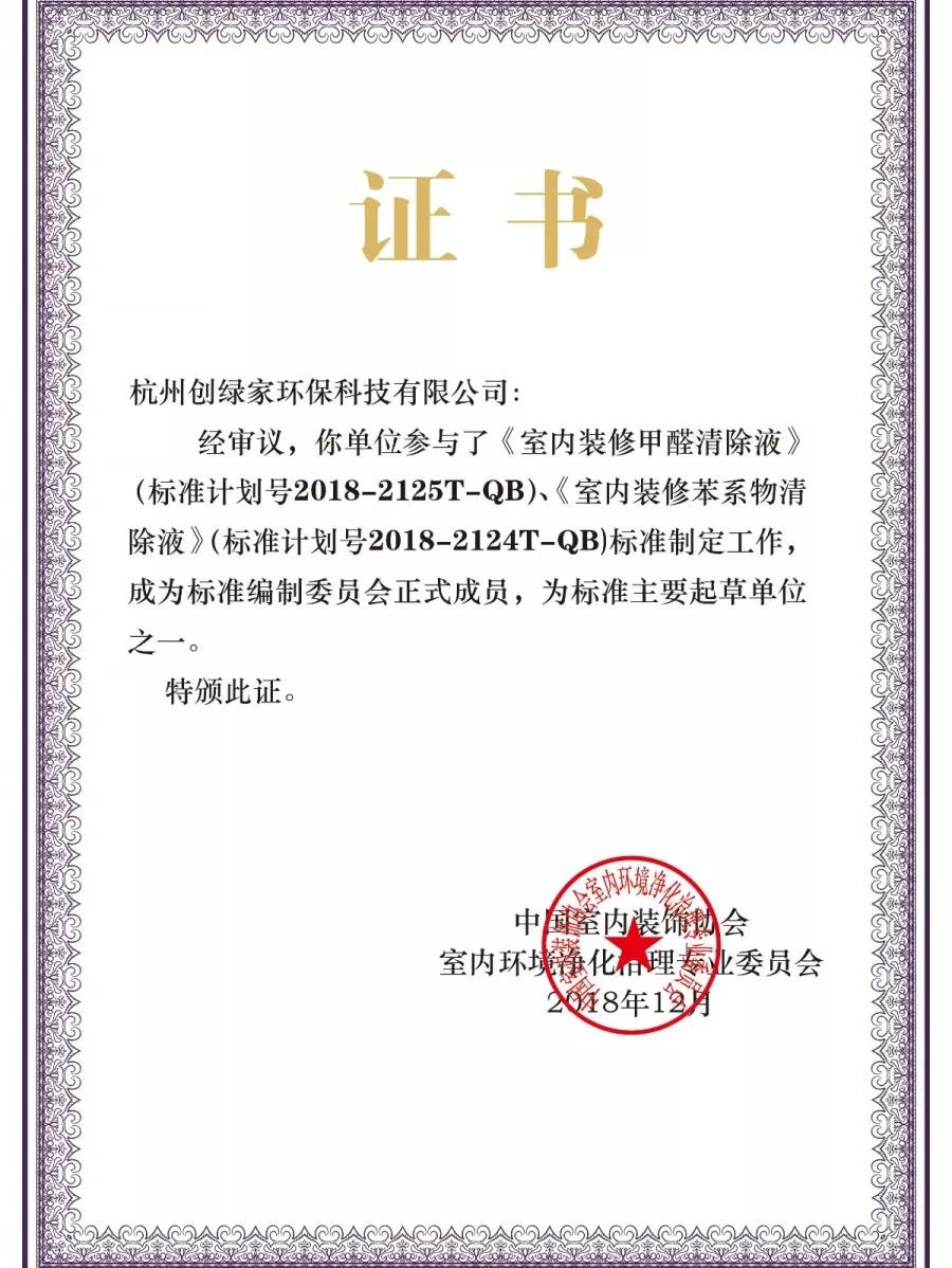 2018年12月19日,中國室內(nèi)環(huán)境凈化治理行業(yè)第五屆技術(shù)創(chuàng)新分享會在北京新聞大廈長安發(fā)布廳舉行。創(chuàng)綠家環(huán)保成為《室內(nèi)裝修甲醛清除液》、《室內(nèi)裝修苯系物清除液》標(biāo)準(zhǔn)內(nèi)編制委員會正式成員,為標(biāo)準(zhǔn)主要起草單位之一,創(chuàng)綠家環(huán)保總裁孫劍被聘任為該標(biāo)準(zhǔn)編委會委員。