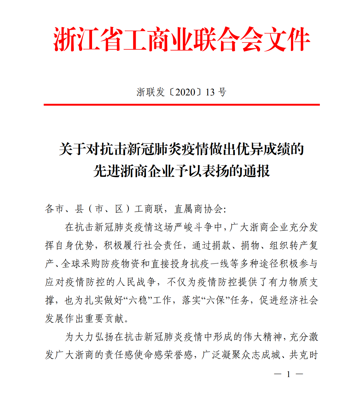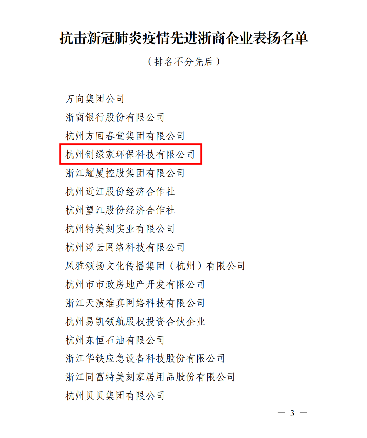 為大力弘揚在抗擊新冠肺炎疫情中形成的偉大精神,充分激發(fā)廣大浙商的責(zé)任感和使命感,近日,浙江省工商業(yè)聯(lián)合會發(fā)布了關(guān)于對抗擊新冠肺炎疫情做出優(yōu)異成績的先進浙商企業(yè)予以表揚的通報,杭州創(chuàng)綠家環(huán)??萍加邢薰颈辉u為“抗擊新冠肺炎疫情先進浙商企業(yè)”。