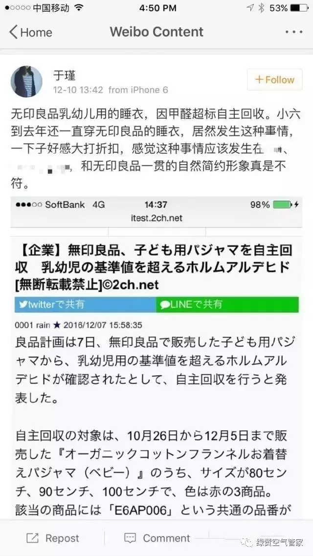 無印良品一直給消費(fèi)者一種材料安全、設(shè)計(jì)簡(jiǎn)約的品牌印象,此番發(fā)生嬰幼兒睡衣甲醛超標(biāo)事件,在日本國(guó)內(nèi)引起不小風(fēng)波,網(wǎng)友表示對(duì)無印良品很失望,對(duì)該品牌其它的有機(jī)產(chǎn)品的安全也產(chǎn)生懷疑。