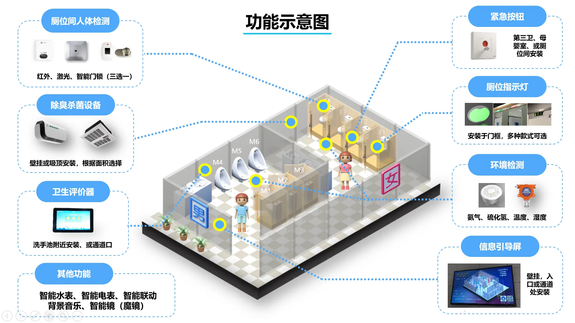 智慧廁所旨在提升公共衛(wèi)生設施的品質和服務水平,為大眾提供更加便捷、舒適和環(huán)保的廁所體驗。如今,隨著科技的不斷進步,智慧廁所系統(tǒng)被廣泛采用和建設,其功能和特點也越來越豐富多樣。下面將介紹智慧廁所系統(tǒng)的內(nèi)容。