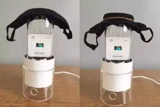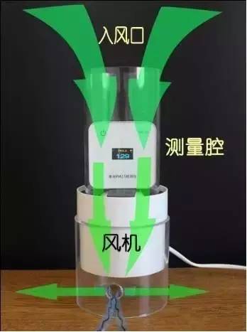 通電后,風機轉(zhuǎn)動時帶動氣體向下流動,將口罩套在入風口,在風機的作用下,氣體透過口罩從入風口進入測量腔中,分別測量通電前PM2.5濃度和口罩過濾后的PM2.5濃度。