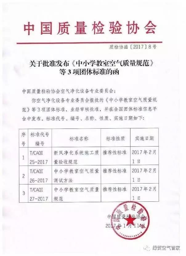 T/CAQI 27-2017《中小學教室空氣質量規(guī)范》是一項綜合性標準,在GB/T 18883-2002的基礎上對關鍵室內空氣質量參數進行規(guī)定。標準的主要內容是:范圍;規(guī)范性引用文件;教室內空氣質量標準;教室內空氣質量檢驗。該標準對二氧化碳(CO2)、顆粒物(PM2.5)、臭氧(O3)、氨(NH3)、甲醛(HCHO)、總揮發(fā)性有機物(TVOC)等參數做出了規(guī)定。