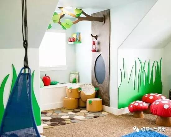 小編的話:墻面的綠草和舒適自然的小蘑菇裝飾以及仿真的鵝卵石地毯等營造出一個(gè)放佛生活在自然世界的小小空間,大樹木上橫叉出小枝椏生動(dòng)無比。